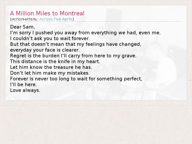 А как ты думаешь, о чем песня "A Million Miles to Montreal" ?