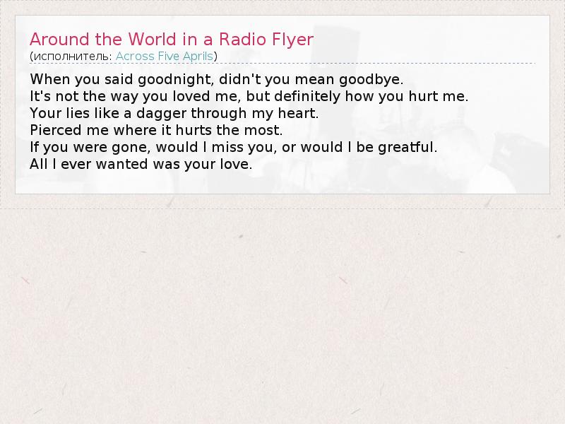ГлавнаяИсполнителиAcross Five AprilsAround the World in a Radio Flyer