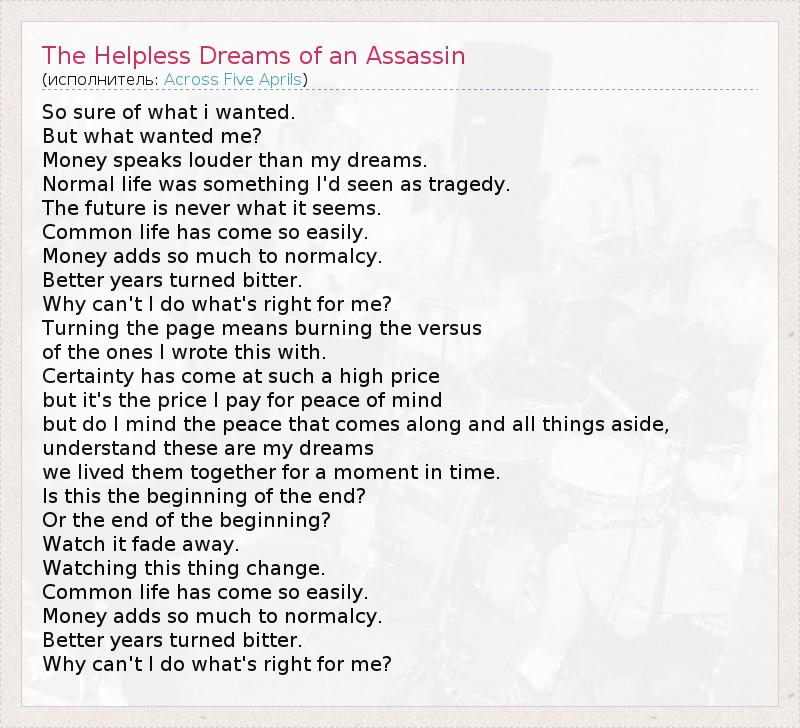 А как ты думаешь, о чем песня "The Helpless Dreams of an Assassin" ?