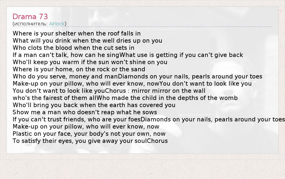 Where is your shelter when the roof falls in What will you drink when the well dries up on you Who clots the blood when the cut sets in If a man can't talk, how can he singWhat use is getting if you can't give back Who'll keep you warm if the sun won't shine on you Where is your home, on the rock or the sand Who do you serve, money and manDiamonds on your nails, pearls around your toes Make-up on your pillow, who will ever know, nowYou don't want to look like you You don't want to look like youChorus : mirror mirror on the wall who's the fairest of them allWho made the child in the depths of the womb Who'll bring you back when the earth has covered you Show me a man who doesn't reap what he sows If you can't trust friends, who are your foesDiamonds on your nails, pearls around your toes Make-up on your pillow, who will ever know, now Plastic on your face, your body's not your own, now To satisfy their eyes, you give away your soulChorus