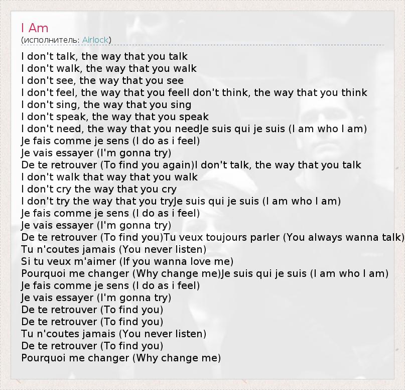I don't talk, the way that you talk I don't walk, the way that you walk I don't see, the way that you see I don't feel, the way that you feelI don't think, the way that you think I don't sing, the way that you sing I don't speak, the way that you speak I don't need, the way that you needJe suis qui je suis (I am who I am) Je fais comme je sens (I do as i feel) Je vais essayer (I'm gonna try) De te retrouver (To find you again)I don't talk, the way that you talk I don't walk that way that you walk I don't cry the way that you cry I don't try the way that you tryJe suis qui je suis (I am who I am) Je fais comme je sens (I do as i feel) Je vais essayer (I'm gonna try) De te retrouver (To find you)Tu veux toujours parler (You always wanna talk) Tu n'coutes jamais (You never listen) Si tu veux m'aimer (If you wanna love me) Pourquoi me changer (Why change me)Je suis qui je suis (I am who I am) Je fais comme je sens (I do as i feel) Je vais essayer (I'm gonna try) De te retrouver (To find you) De te retrouver (To find you) Tu n'coutes jamais (You never listen) De te retrouver (To find you) Pourquoi me changer (Why change me)