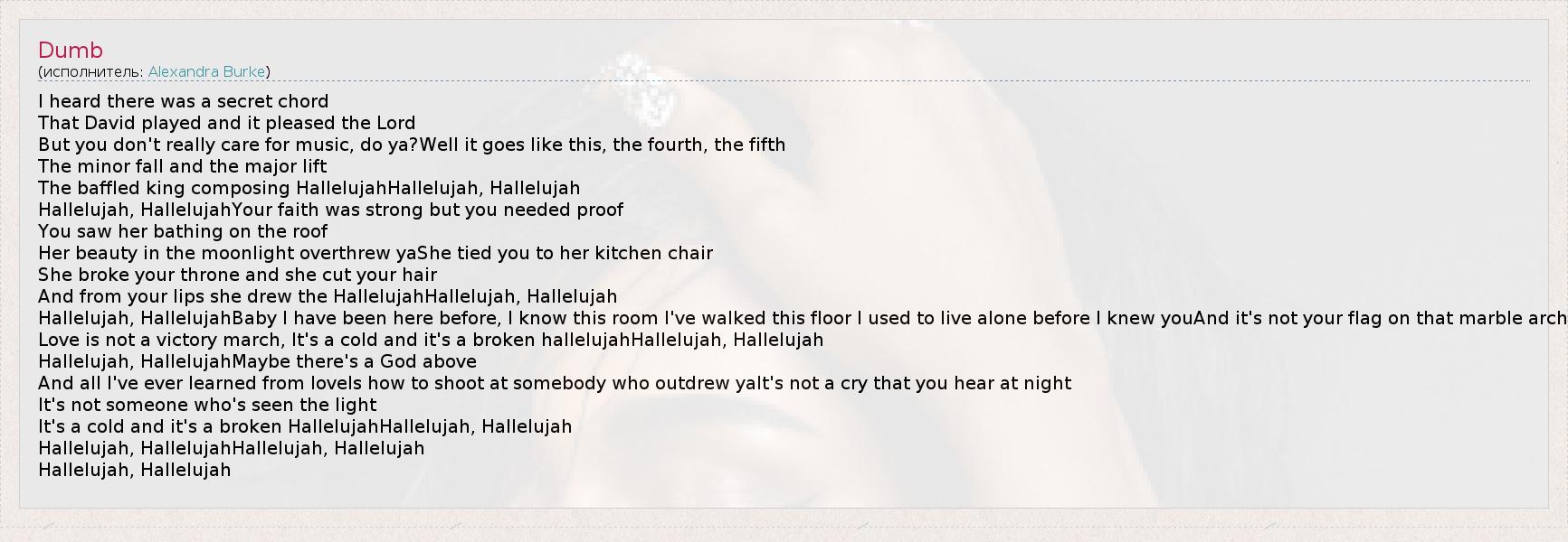 Hallelujah, HallelujahBaby I have been here before, I know this room I've walked this floor I used to live alone before I knew youAnd it's not your flag on that marble arch