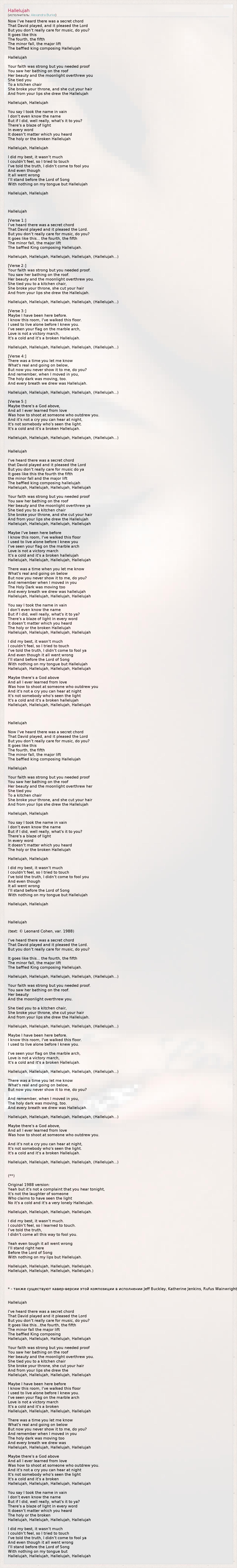 (автор оригинальных слов песни: © Leonard Cohen, /вариант 1988 года/)