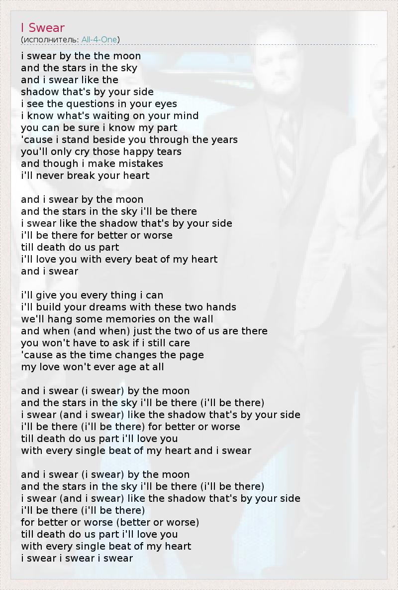 Это интересно:All-4-One - американская R&B-группа, наиболее известная своим мегахитом 1994 года - поп-балладой "I Swear". В составе группы четыре вокалиста: Jamie Jones, Delious Kennedy, Alfred Nevarez и Tony Borowiak. За свою карьеру группа продала более 22 миллионов своих записей.Хит All-4-One "Клянусь" (I swear) держался на первой строчке американского хит-парада Billboard Hot 100 одиннадцать недель, стал №2 в национальном британском... продолжение