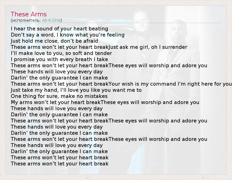 These arms won't let your heart breakJust ask me girl, oh I surrender