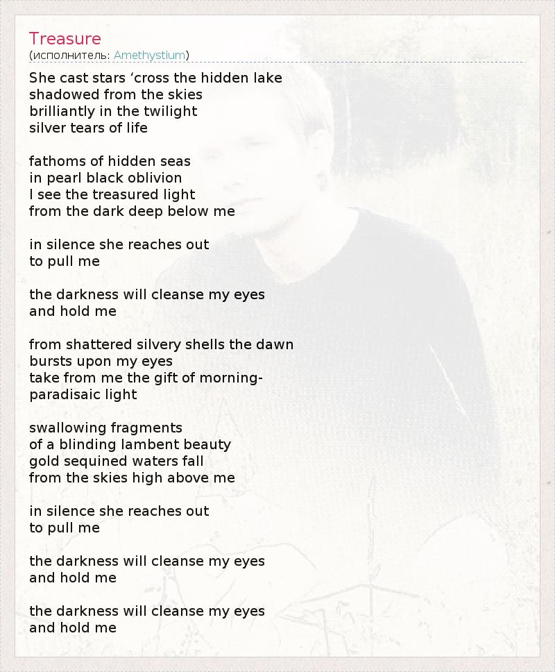 Она бросила звезд " пересечь скрытый озеро тени с неба блестяще в сумерках серебряные слезы жизни саженей скрытых морей в жемчуга черного забвения Я вижу заветный свет оттемно- глубоко под меня в тишине она протягивает руку тянуть меня темнота очистит глаза и держать меня от разбитых серебристыми оболочек рассвет всплески Честное глаз принять от меня дар утром - райский свет глотания фрагменты из ослепительной мерцающего красоты золото блестками воды падают с небес высоко надо мной в тишине она протягивает руку тянуть меня темнота очистит глаза и держать меня темнота очистит глаза и держать меня