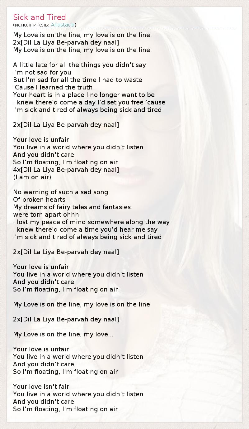 My Love is on the line, my love is on the line 2x[Dil La Liya Be-parvah dey naal] My Love is on the line, my love is on the line A little late for all the things you didn't say I'm not sad for you But I'm sad for all the time I had to waste 'Cause I learned the truth Your heart is in a place I no longer want to be I knew there'd come a day I'd set you free 'cause I'm sick and tired of always being sick and tired 2x[Dil La Liya Be-parvah dey naal] Your love is unfair You live in a world where you didn't listen And you didn't care So I'm floating, I'm floating on air 4x[Dil La Liya Be-parvah dey naal] (I am on air) No warning of such a sad song Of broken hearts My dreams of fairy tales and fantasies were torn apart ohhh I lost my peace of mind somewhere along the way I knew there'd come a time you'd hear me say I'm sick and tired of always being sick and tired 2x[Dil La Liya Be-parvah dey naal] Your love is unfair You live in a world where you didn't listen And you didn't care So I'm floating, I'm floating on air My Love is on the line, my love is on the line 2x[Dil La Liya Be-parvah dey naal] My Love is on the line, my love... Your love is unfair You live in a world where you didn't listen And you didn't care So I'm floating, I'm floating on air Your love isn't fair You live in a world where you didn't listen And you didn't care So I'm floating, I'm floating on air