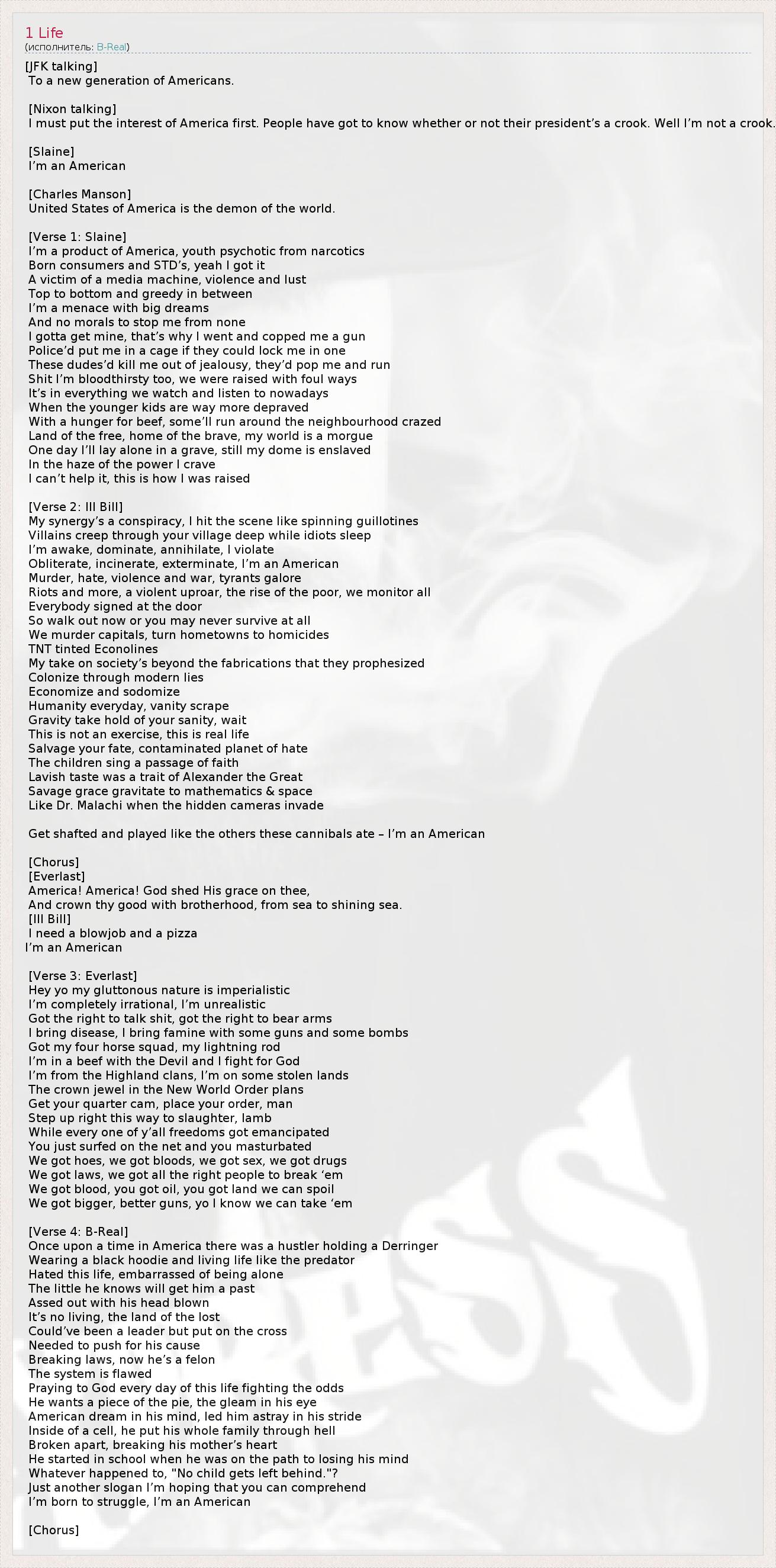 [JFK]: Новому поколению американцев. [Никсон]: Я должен поставить на первое место интересы нации. Люди должны знать действительно ли их президент жулик. Что ж, я не жулик. [Slaine]: Я - американец [Чарльз Мэнсон]: Соединенные Штаты Америки – демон мира. [Куплет 1: Slaine] Я продукт Америки, юнец, помешавшийся от наркотиков Рожденный потребителями и вениками, да Жертва медиа машины, насилия и похоти От начала до конца и жадный посередине Я опасный человек с большими мечтами Лишенный морали, способной остановить меня Я должен получить своё, вот зачем я пришел и схватил оружие Полиция посадила бы меня в клетку, если бы они могли закрыть меня Эти чуваки убили бы меня из ревности, они бы подстрелили меня и убежали Вот дерьмо, я тоже кровожаден, нас воспитали грязными методами Это проникло во всё, что мы видим и слушаем Когда дети помладше еще более развращены Жаждой говядины, некоторые будут бегать по свихнувшимся дворам Земля свободы, дом храбрости, мой мир – это морг Однажды я бужу лежать один в могиле, а моя башка будет всё ещё порабощена В тумане власти я жажду Я не могу помогать, так я был воспитан [Куплет 2: Ill Bill] Моя синергия – тайный замысел, я поражаю сцену как вращающиеся гильотины Злодеи глубоко проникают в твою деревню, пока идиоты спят Я не сплю, доминирую, уничтожаю, я оскверняю Стираю, сжигаю, истребляю, я - американец Убийство, ненависть, насилие и война, изобилие тиранов Бунты и больше, сильные волнения, восстание бедняков, мы отслеживаем всё У всех метка на двери Так выйди сейчас и тебе уже не выжить Мы убиваем столицы, превращаем родные города в пристанище убийц Тротил окрасил Эколайны В моем мнении об обществе нет фальсификаций, что они предсказали Колонизируй посредством современной лжи Экономь и содомизируй Повседневное человечество, тщеславные ссоры Сила тяжести давит на твое здравомыслие, подожди Это не упражнение, это реальная жизнь Спаси свою судьбу, загрязненную планету ненависти Дети поют принятие веры Щедрый вкус был чертой Александра Великого Дикое изящество гравитации переходит к математике и космосу Как доктор Малачи, когда вторгаются скрытые камеры Опростоволосься и играй как другие, эти каннибалы поели – Я - американец [Припев] [Everlast] Америка! Америка! Бог излил свою благодать на тебя, И вознаградил твою доброту братством, от моря до моря. [Ill Bill] Мне нужен минет и пицца Я - американец [Verse 3: Everlast] Мой прожорливый характер - империалистический Я абсолютно иррационален, я нереалистичен У меня есть право нести чушь и право служить в армии Я приношу болезнь и голод с оружием и бомбами У меня есть четыре сотни лошадиных сил, форд Lightning Rod Я жалуюсь на дьявола, и борюсь за Бога Я выходец из Горных кланов, я живу на украденных землях Украшения короны в планах Нового мирового порядка Получи камеру обозряющую квартал, размести свой заказ Шагни прямо сюда, чтобы оставить овцу на заклание Пока каждую твою свободу эмансипируют Ты просто бродил по сети и мастурбировал Мы получили шлюх, кровь, секс, наркотики Мы получили законы, мы получили всех правильных людей, чтобы сломать их Мы получили кровь, ты получил нефть, ты получил землю, которую мы можем испортить Мы получили большее, лучшее оружие, эй, я знаю, что мы можем убить их [Куплет 4: B-Real] Когда-то давно в Америке был ловкач с Дерринджером Он носил черный балахон и жил жизнью как хищник Нен