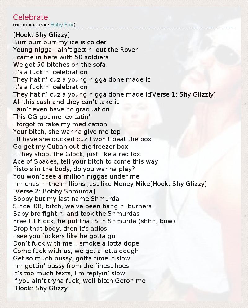[Hook: Shy Glizzy] Burr burr burr my ice is colder Young nigga I ain't gettin' out the Rover I came in here with 50 soldiers We got 50 bitches on the sofa It's a fuckin' celebration They hatin' cuz a young nigga done made it It's a fuckin' celebration They hatin' cuz a young nigga done made it[Verse 1: Shy Glizzly] All this cash and they can't take it I ain't even have no graduation This OG got me levitatin' I forgot to take my medication Your bitch, she wanna give me top I'll have she ducked cuz I won't beat the box Go get my Cuban out the freezer box If they shoot the Glock, just like a red fox Ace of Spades, tell your bitch to come this way Pistols in the body, do you wanna play? You won't see a million niggas under me I'm chasin' the millions just like Money Mike[Hook: Shy Glizzy] [Verse 2: Bobby Shmurda] Bobby but my last name Shmurda Since '08, bitch, we've been bangin' burners Baby bro fightin' and took the Shmurdas Free Lil Flock, he put that S in Shmurda (shhh, bow) Drop that body, then it's adios I see you fuckers like he gotta go Don't fuck with me, I smoke a lotta dope Come fuck with us, we get a lotta dough Get so much pussy, gotta time it slow I'm gettin' pussy from the finest hoes It's too much texts, I'm replyin' slow If you ain't tryna fuck, well bitch Geronimo [Hook: Shy Glizzy]