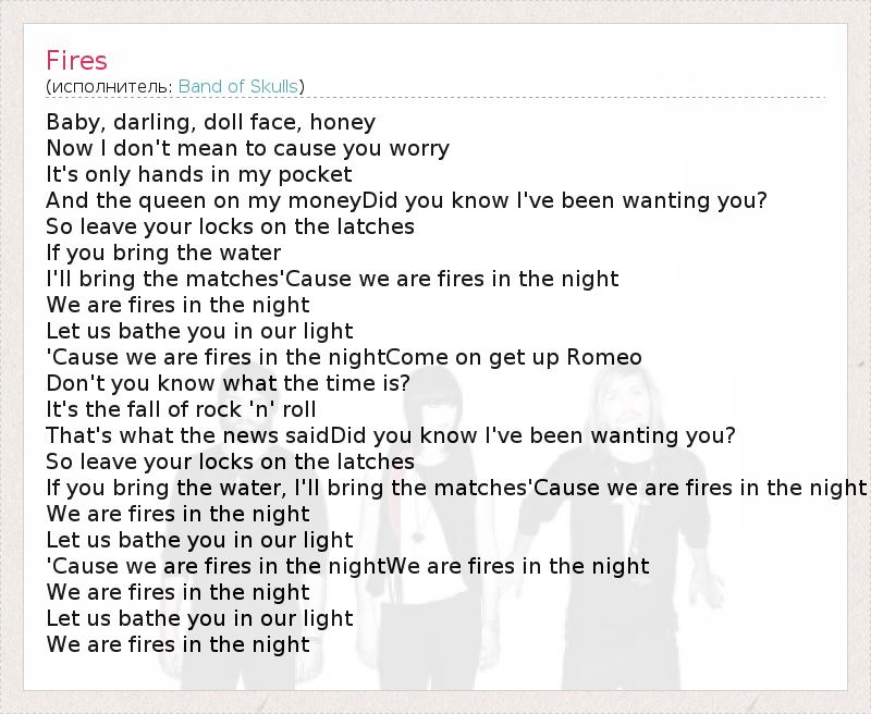 If you bring the water, I'll bring the matches'Cause we are fires in the night
