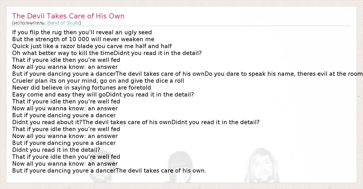 If you flip the rug then you'll reveal an ugly seed But the strength of 10 000 will never weaken me Quick just like a razor blade you carve me half and half Oh what better way to kill the timeDidnt you read it in the detail? That if youre idle then you're well fed Now all you wanna know: an answer But if youre dancing youre a dancerThe devil takes care of his ownDo you dare to speak his name, theres evil at the room Crueler plan its on your mind, go on and give the dice a roll Never did believe in saying fortunes are foretold Easy come and easy they will goDidnt you read it in the detail? That if youre idle then you're well fed Now all you wanna know: an answer But if youre dancing youre a dancer Didnt you read about it?The devil takes care of his ownDidnt you read it in the detail? That if youre idle then you're well fed Now all you wanna know: an answer But if youre dancing youre a dancer Didnt you read it in the detail? That if youre idle then you're well fed Now all you wanna know: an answer But if youre dancing youre a dancerThe devil takes care of his own.