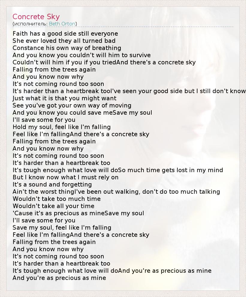 Faith has a good side still everyone She ever loved they all turned bad Constance his own way of breathing And you know you couldn't will him to survive Couldn't will him if you if you triedAnd there's a concrete sky Falling from the trees again And you know now why It's not coming round too soon It's harder than a heartbreak tooI've seen your good side but I still don't know Just what it is that you might want See you've got your own way of moving And you know you could save meSave my soul I'll save some for you Hold my soul, feel like I'm falling Feel like I'm fallingAnd there's a concrete sky Falling from the trees again And you know now why It's not coming round too soon It's harder than a heartbreak too It's tough enough what love will doSo much time gets lost in my mind But I know now what I must rely on It's a sound and forgetting Ain't the worst thingI've been out walking, don't do too much talking Wouldn't take too much time Wouldn't take all your time 'Cause it's as precious as mineSave my soul I'll save some for you Save my soul, feel like I'm falling Feel like I'm fallingAnd there's a concrete sky Falling from the trees again And you know now why It's not coming round too soon It's harder than a heartbreak too It's tough enough what love will doAnd you're as precious as mine And you're as precious as mine
