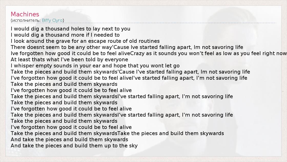 Это интересно:В 1995 году, который можно считать годом рождения Biffy Clyro, будущий вокалист, гитарист и композитор Саймон Нил, 15 лет от роду, еще учился в общеобразовательной школе в шотландском городке Эре. Хотя с пяти лет он играл на скрипке, его призванием стала не классика, а рок-музыка: наслушавшись Nirvana, Weezer и Pearl Jam, он всерьез взялся за гитару в начале 95 года решил, что пора становиться настоящим фронтменом... продолжение