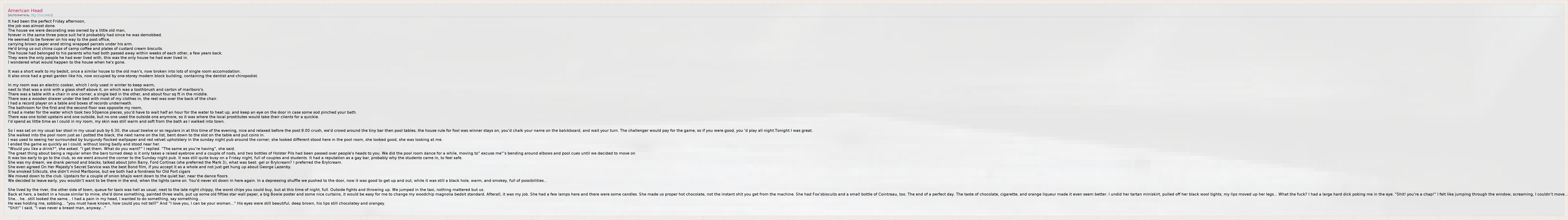 It had been the perfect Friday afternoon, the job was almost done. The house we were decorating was owned by a little old man, forever in the same three piece suit he'd probabbly had since he was demobbed. He seemed to be forever on his way to the post office, carrying brown paper ansd string wrapped parcels under his arm. He'd bring us out china cups of camp coffee and plates of custard cream biscuits. The house had belonged to his parents who had both passed away within weeks of each other, a few years back. They were the only people he had ever lived with, this was the only house he had ever lived in. I wondered what would happen to the house when he's gone. It was a short walk to my bedsit, once a similar house to the old man's, now broken into lots of single room accomodation. It also once had a great garden like his, now occupied by one-storey modern block building, containing the dentist and chiropodist. In my room was an electric cooker, which I only used in winter to keep warm, next to that was a sink with a glass shelf above it, on which was a toothbrush and carton of marlboro's. There was a table with a chair in one corner, a single bed in the other, and about four sq ft in the middle. There was a wooden drawer under the bed with most of my clothes in, the rest was over the back of the chair. I had a record player on a table and boxes of records underneath. The bathroom for the first and the second floor was opposite my room, it had a meter for the water which took two 50pence pieces, you'd have to wait half an hour for the water to heat up, and keep an eye on the door in case some sod pinched your bath. There was one toilet upstairs and one outside, but no one used the outside one anymore, so it was where the local prostitutes would take their clients for a quickie. I'd spend as little time as I could in my room, my skin was still warm and soft from the bath as I walked into town. So I was sat on my usual bar stool in my usual pub by 6.30, the usual twelve or so regulars in at this time of the evening, nice and relaxed before the post 8.00 crush, we'd crowd around the tiny bar then pool tables, the house rule for fool was winner stays on, you'd chalk your name on the balckboard, and wait your turn. The challenger would pay for the game, so if you were good, you 'd play all night.Tonight I was great. She walked into the pool room just as I potted the black, the next name on the list, bent down to the slot on the table and put coins in. I was used to seeing her surrounded by burgundy flocked wallpaper and red velvet upholstery in the sunday night pub around the corner; she looked different stood here in the pool room, she looked good, she was looking at me. I ended the game as quickly as I could, without losing badly and stood near her. "Would you like a drink?", she asked. "I get them. What do you want?" I replied. "The same as you're having", she said. The great thing about being a regular when the bars turned deep is it only takes a raised eyebrow and a couple of nods, and two bottles of Holster Pils had been passed over people's heads to you. We did the pool room dance for a while, moving to" excuse me"'s bending around elbows and pool cues until we decided to move on It was too early to go to the club, so we went around the corner to the Sunday night pub. It was still quite busy on a Friday night, full of couples and students. It had a reputation as a gay bar, probably why the students came in, to feel safe. She was my dream, we drank pernod and blacks, talked about John Barry, Ford Cortinas (she preferred the Mark 3), what was best: gel or Brylcream? I preferred the Brylcream. She even agreed On Her Majesty's Secret Service was the best Bond film, if you accept it as a whole and not just get hung up about George Lazenby. She smoked Silkcuts, she didn't mind Marlboros, but we both had a fondness for Old Port cigars We moved down to the club. Upstairs for a couple of onion bhajis went down to the quiet bar, near the dance floors. We decided to leave early, you wouldn't want to be there in the end, when the lights came on. You'd never sit down in here again. In a depressing shuffle we pushed to the door, now it was good to get up and out, while it was still a black hole, warm, and smokey, full of possibilities... She lived by the river, the other side of town, queue for taxis was hell as usual, next to the late night chippy, the worst chips you could buy, but at this time of night, full. Outside fights and throwing up. We jumped in the taxi, nothing mattered but us. Back at hers, a bedsit in a house similar to mine, she'd done something, painted three walls, put up some old fifties star wall paper, a big Bowie poster and some nice curtains, it would be easy for me to change my woodchip magnolia bedsit standard. Afterall, it was my job. She had a few lamps here and there were some candles. She made us proper hot chocolate, not the instant shit you get from the machine. She had Fox'sbiscuits and a small bottle of Cointreau, too. The end of a perfect day. The taste of chocolate, cigarette, and orange liqueur made it even seem better. I undid her tartan miniskirt, pulled off her black wool tights, my lips moved up her legs... What the fuck? I had a large hard dick poking me in the eye. "Shit! you're a chap!" I felt like jumping through the window, screaming, I couldn't move... She... he...still looked the same... I had a pain in my head, I wanted to do something, say something... He was holding me, sobbing... "you must have known, how could you not tell?" And "I love you, I can be your woman..." His eyes were still beautiful, deep brown, his lips still chocolatey and orangey. "Shit!" I said, "I was never a breast man, anyway..."