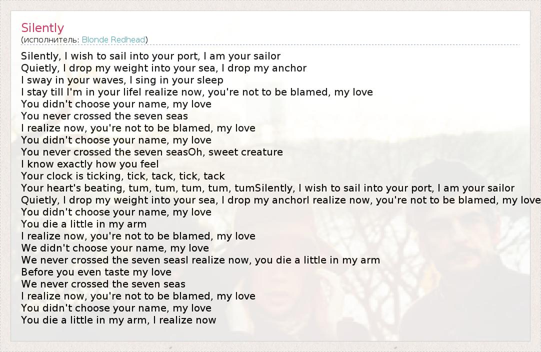 Quietly, I drop my weight into your sea, I drop my anchorI realize now, you're not to be blamed, my love