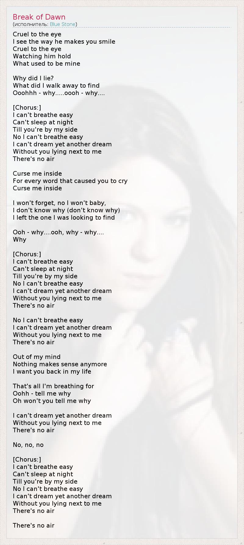 Cruel to the eye I see the way he makes you smile Cruel to the eye Watching him hold What used to be mine Why did I lie? What did I walk away to find Ooohhh - why.....oooh - why.... [Chorus:] I can't breathe easy Can't sleep at night Till you're by my side No I can't breathe easy I can't dream yet another dream Without you lying next to me There's no air Curse me inside For every word that caused you to cry Curse me inside I won't forget, no I won't baby, I don't know why (don't know why) I left the one I was looking to find Ooh - why....ooh, why - why.... Why [Chorus:] I can't breathe easy Can't sleep at night Till you're by my side No I can't breathe easy I can't dream yet another dream Without you lying next to me There's no air No I can't breathe easy I can't dream yet another dream Without you lying next to me There's no air Out of my mind Nothing makes sense anymore I want you back in my life That's all I'm breathing for Oohh - tell me why Oh won't you tell me why I can't dream yet another dream Without you lying next to me There's no air No, no, no [Chorus:] I can't breathe easy Can't sleep at night Till you're by my side No I can't breathe easy I can't dream yet another dream Without you lying next to me There's no air There's no air