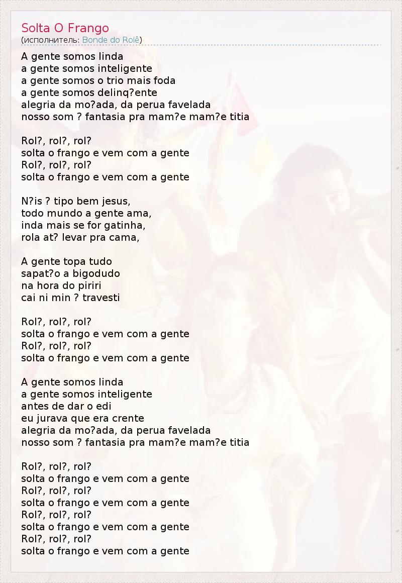 A gente somos linda a gente somos inteligente a gente somos o trio mais foda a gente somos delinq?ente alegria da mo?ada, da perua favelada nosso som ? fantasia pra mam?e mam?e titia Rol?, rol?, rol? solta o frango e vem com a gente Rol?, rol?, rol? solta o frango e vem com a gente N?is ? tipo bem jesus, todo mundo a gente ama, inda mais se for gatinha, rola at? levar pra cama, A gente topa tudo sapat?o a bigodudo na hora do piriri cai ni min ? travesti Rol?, rol?, rol? solta o frango e vem com a gente Rol?, rol?, rol? solta o frango e vem com a gente A gente somos linda a gente somos inteligente antes de dar o edi eu jurava que era crente alegria da mo?ada, da perua favelada nosso som ? fantasia pra mam?e mam?e titia Rol?, rol?, rol? solta o frango e vem com a gente Rol?, rol?, rol? solta o frango e vem com a gente Rol?, rol?, rol? solta o frango e vem com a gente Rol?, rol?, rol? solta o frango e vem com a gente