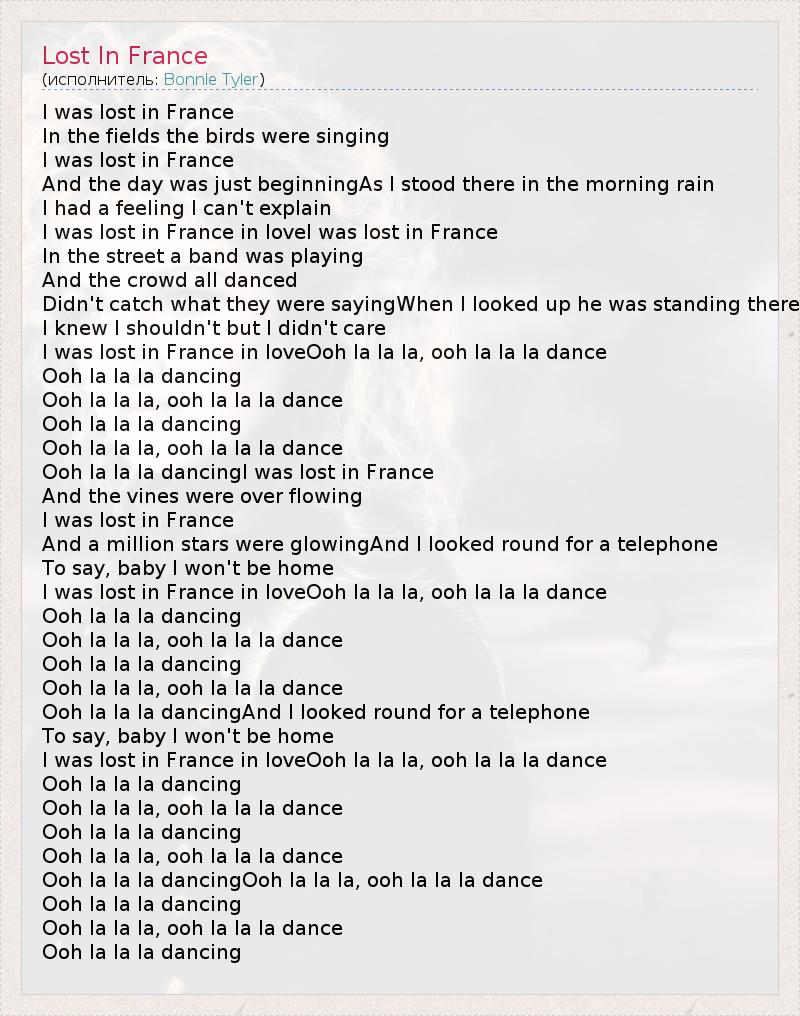 I was lost in France In the fields the birds were singing I was lost in France And the day was just beginningAs I stood there in the morning rain I had a feeling I can't explain I was lost in France in loveI was lost in France In the street a band was playing And the crowd all danced Didn't catch what they were sayingWhen I looked up he was standing there I knew I shouldn't but I didn't care I was lost in France in loveOoh la la la, ooh la la la dance Ooh la la la dancing Ooh la la la, ooh la la la dance Ooh la la la dancing Ooh la la la, ooh la la la dance Ooh la la la dancingI was lost in France And the vines were over flowing I was lost in France And a million stars were glowingAnd I looked round for a telephone To say, baby I won't be home I was lost in France in loveOoh la la la, ooh la la la dance Ooh la la la dancing Ooh la la la, ooh la la la dance Ooh la la la dancing Ooh la la la, ooh la la la dance Ooh la la la dancingAnd I looked round for a telephone To say, baby I won't be home I was lost in France in loveOoh la la la, ooh la la la dance Ooh la la la dancing Ooh la la la, ooh la la la dance Ooh la la la dancing Ooh la la la, ooh la la la dance Ooh la la la dancingOoh la la la, ooh la la la dance Ooh la la la dancing Ooh la la la, ooh la la la dance Ooh la la la dancing