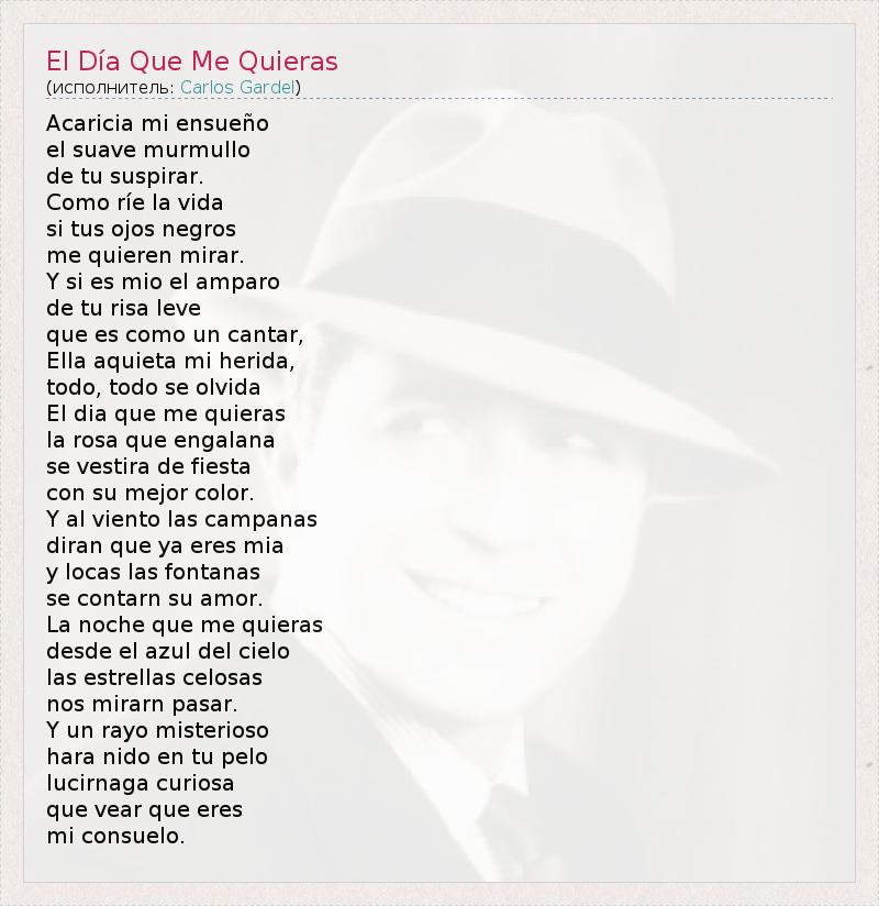 Acaricia mi ensueño el suave murmullo de tu suspirar. Como ríe la vida si tus ojos negros me quieren mirar. Y si es mio el amparo de tu risa leve que es como un cantar, Ella aquieta mi herida, todo, todo se olvida El dia que me quieras la rosa que engalana se vestira de fiesta con su mejor color. Y al viento las campanas diran que ya eres mia y locas las fontanas se contarn su amor. La noche que me quieras desde el azul del cielo las estrellas celosas nos mirarn pasar. Y un rayo misterioso hara nido en tu pelo lucirnaga curiosa que vear que eres mi consuelo.