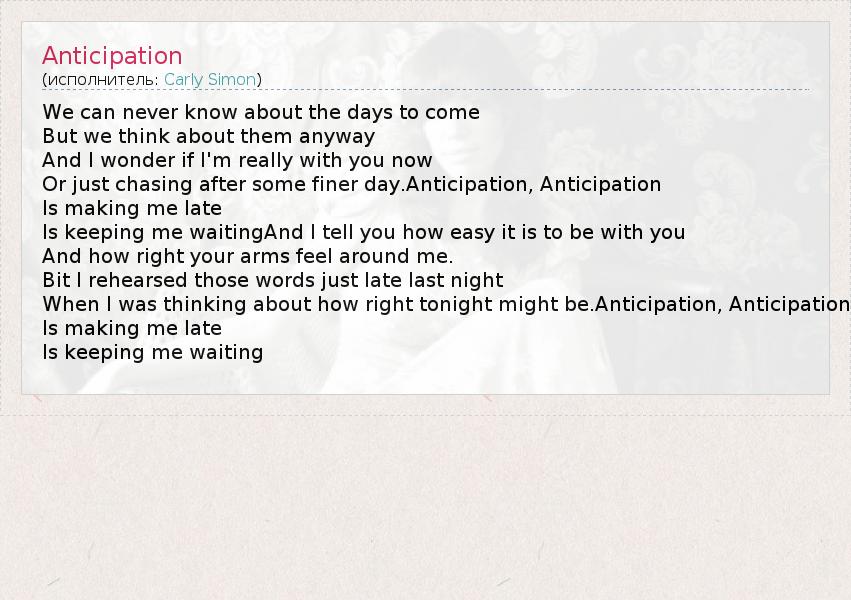 We can never know about the days to come But we think about them anyway And I wonder if I'm really with you now Or just chasing after some finer day.Anticipation, Anticipation Is making me late Is keeping me waitingAnd I tell you how easy it is to be with you And how right your arms feel around me. Bit I rehearsed those words just late last night When I was thinking about how right tonight might be.Anticipation, Anticipation Is making me late Is keeping me waiting