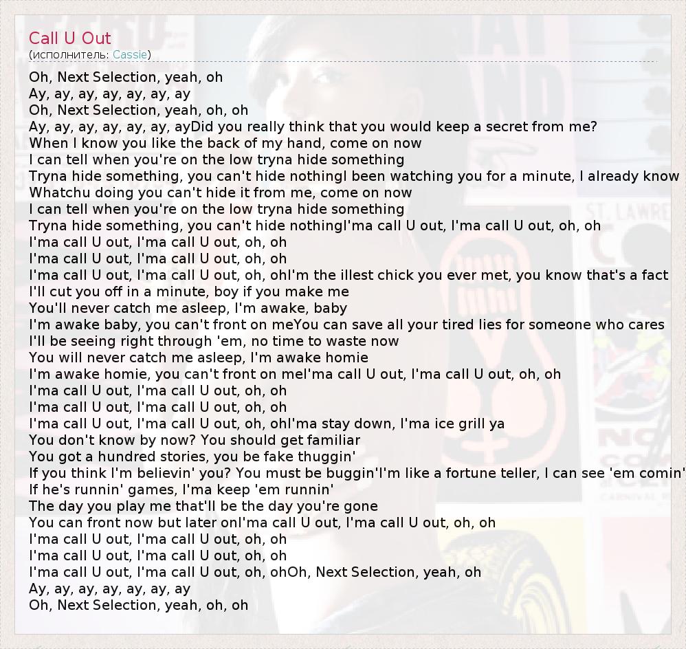 Tryna hide something, you can't hide nothingI'ma call U out, I'ma call U out, oh, oh