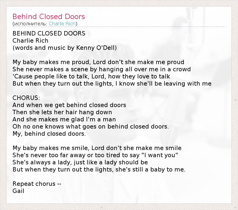 BEHIND CLOSED DOORS Charlie Rich (words and music by Kenny O'Dell) My baby makes me proud, Lord don't she make me proud She never makes a scene by hanging all over me in a crowd 'Cause people like to talk, Lord, how they love to talk But when they turn out the lights, I know she'll be leaving with me CHORUS: And when we get behind closed doors Then she lets her hair hang down And she makes me glad I'm a man Oh no one knows what goes on behind closed doors. My, behind closed doors. My baby makes me smile, Lord don't she make me smile She's never too far away or too tired to say "I want you" She's always a lady, just like a lady should be But when they turn out the lights, she's still a baby to me. Repeat chorus -- Gail