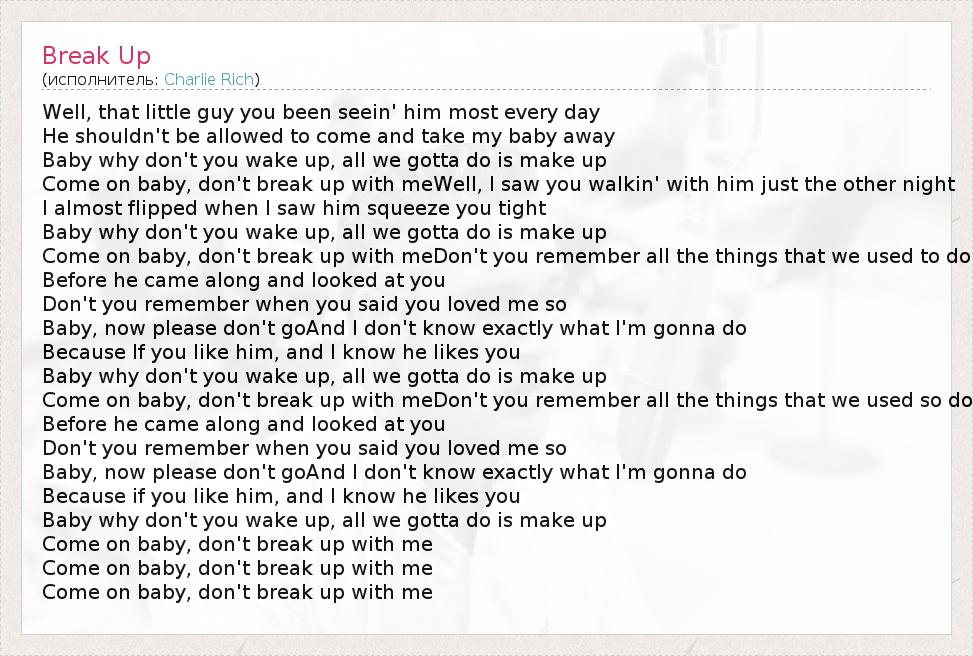 Come on baby, don't break up with meWell, I saw you walkin' with him just the other night