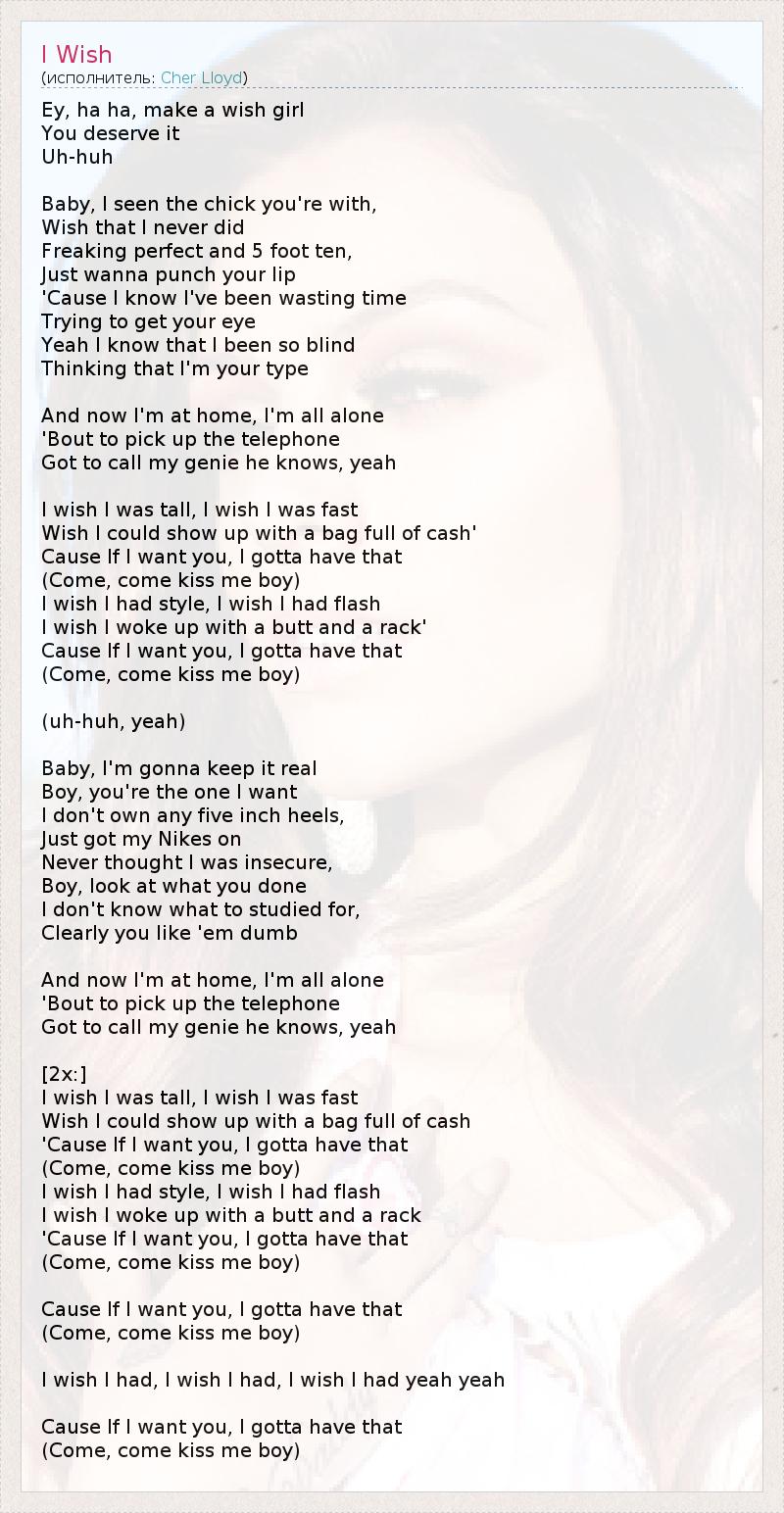 Ey, ha ha, make a wish girl You deserve it Uh-huh Baby, I seen the chick you're with, Wish that I never did Freaking perfect and 5 foot ten, Just wanna punch your lip 'Cause I know I've been wasting time Trying to get your eye Yeah I know that I been so blind Thinking that I'm your type And now I'm at home, I'm all alone 'Bout to pick up the telephone Got to call my genie he knows, yeah I wish I was tall, I wish I was fast Wish I could show up with a bag full of cash' Cause If I want you, I gotta have that (Come, come kiss me boy) I wish I had style, I wish I had flash I wish I woke up with a butt and a rack' Cause If I want you, I gotta have that (Come, come kiss me boy) (uh-huh, yeah) Baby, I'm gonna keep it real Boy, you're the one I want I don't own any five inch heels, Just got my Nikes on Never thought I was insecure, Boy, look at what you done I don't know what to studied for, Clearly you like 'em dumb And now I'm at home, I'm all alone 'Bout to pick up the telephone Got to call my genie he knows, yeah [2x:] I wish I was tall, I wish I was fast Wish I could show up with a bag full of cash 'Cause If I want you, I gotta have that (Come, come kiss me boy) I wish I had style, I wish I had flash I wish I woke up with a butt and a rack 'Cause If I want you, I gotta have that (Come, come kiss me boy) Cause If I want you, I gotta have that (Come, come kiss me boy) I wish I had, I wish I had, I wish I had yeah yeah Cause If I want you, I gotta have that (Come, come kiss me boy)