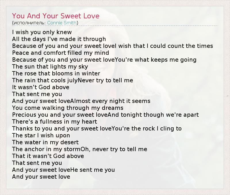 I wish you only knew All the days I've made it through Because of you and your sweet loveI wish that I could count the times Peace and comfort filled my mind Because of you and your sweet loveYou're what keeps me going The sun that lights my sky The rose that blooms in winter The rain that cools julyNever try to tell me It wasn't God above That sent me you And your sweet loveAlmost every night it seems You come walking through my dreams Precious you and your sweet loveAnd tonight though we're apart There's a fullness in my heart Thanks to you and your sweet loveYou're the rock I cling to The star I wish upon The water in my desert The anchor in my stormOh, never try to tell me That it wasn't God above That sent me you And your sweet loveHe sent me you And your sweet love