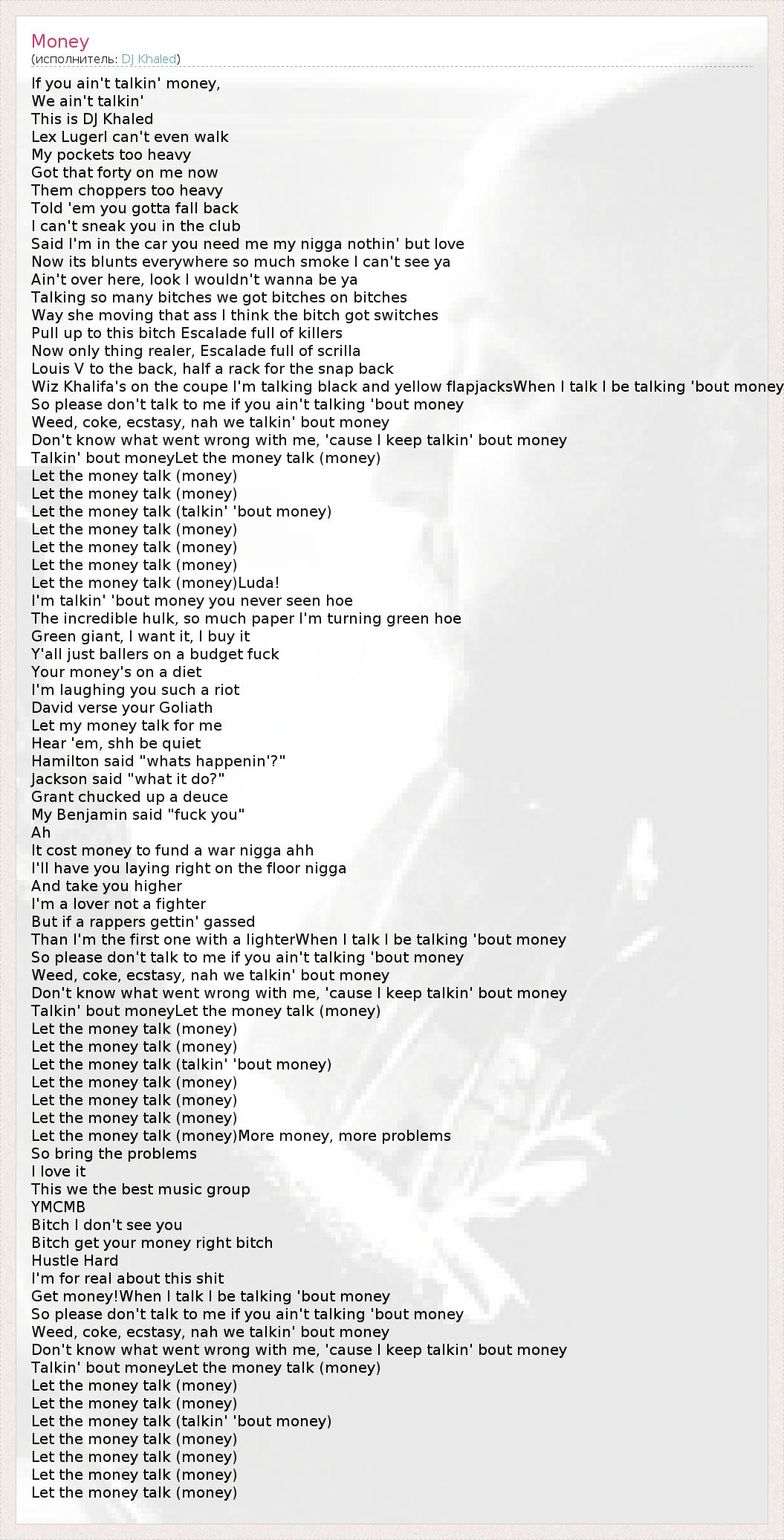 Это интересно:Dj Khaled родился в Новом Орлеане, штат Луизиана . Он имеет палестинские корни и живет в Пемброк Пайнс Ознакомившись с треклистами двух альбомов DJ Khaled, есть риск поймать себя на желании навесить на него ярлык главного жулика и халявщика современного хип-хопа" - на обеих пластинках всего 3 песни с его продакшном. При этом он не читает рэп и не поет – впору трясти чеком и требовать сатисфакции.... продолжение