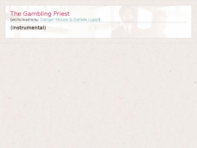 Это интересно:Продюсер Брайан Бартон, известный миру как Danger Mouse, работавший в таких проектах как Gnarls Barkley, Gorillaz, Broken Bells и других, задумал записать альбом, который бы отличался от всего того, что он делал раньше. В результате, вдохновившись спагетти-вестернами 60х-70х годов прошлого века и объединив усилия с итальянским композитором Даниэле Луппи, весной 2011 был выпущен альбом, получивший название Rome.... продолжение