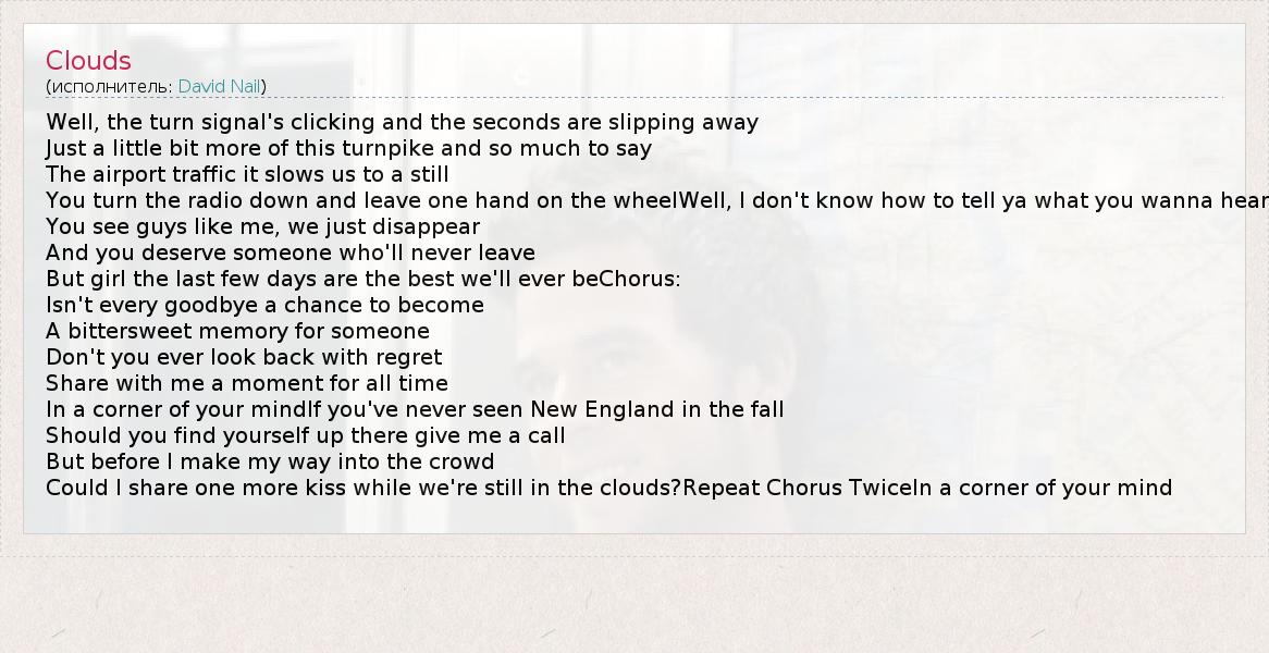 Could I share one more kiss while we're still in the clouds?Repeat Chorus TwiceIn a corner of your mind