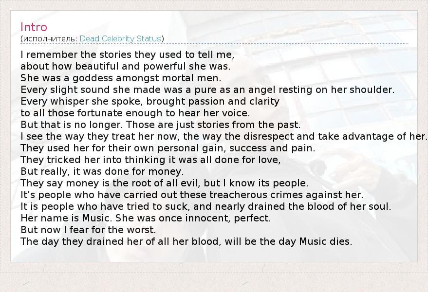 Это интересно:В 2004 на свет родилась новая группа под названием Dead Celebrity Status, состоящая из 3-х человек - DJ Dopey, Yas и Bobby