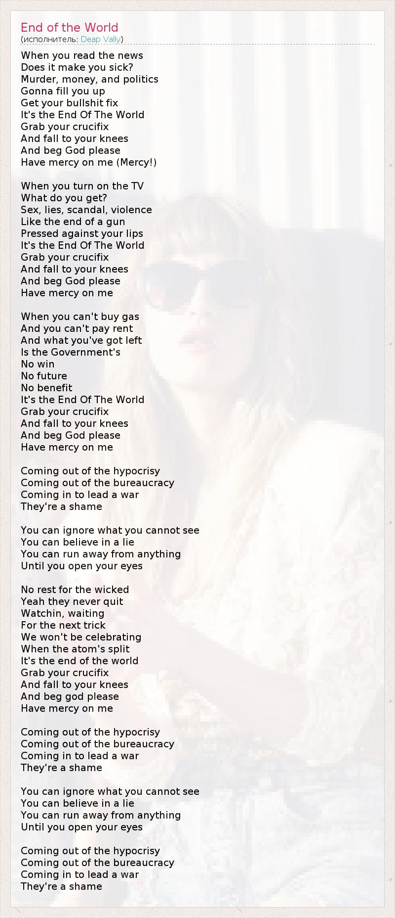 When you read the news Does it make you sick? Murder, money, and politics Gonna fill you up Get your bullshit fix It's the End Of The World Grab your crucifix And fall to your knees And beg God please Have mercy on me (Mercy!) When you turn on the TV What do you get? Sex, lies, scandal, violence Like the end of a gun Pressed against your lips It's the End Of The World Grab your crucifix And fall to your knees And beg God please Have mercy on me When you can't buy gas And you can't pay rent And what you've got left Is the Government's No win No future No benefit It's the End Of The World Grab your crucifix And fall to your knees And beg God please Have mercy on me Coming out of the hypocrisy Coming out of the bureaucracy Coming in to lead a war They're a shame You can ignore what you cannot see You can believe in a lie You can run away from anything Until you open your eyes No rest for the wicked Yeah they never quit Watchin, waiting For the next trick We won't be celebrating When the atom's split It's the end of the world Grab your crucifix And fall to your knees And beg god please Have mercy on me Coming out of the hypocrisy Coming out of the bureaucracy Coming in to lead a war They're a shame You can ignore what you cannot see You can believe in a lie You can run away from anything Until you open your eyes Coming out of the hypocrisy Coming out of the bureaucracy Coming in to lead a war They're a shame