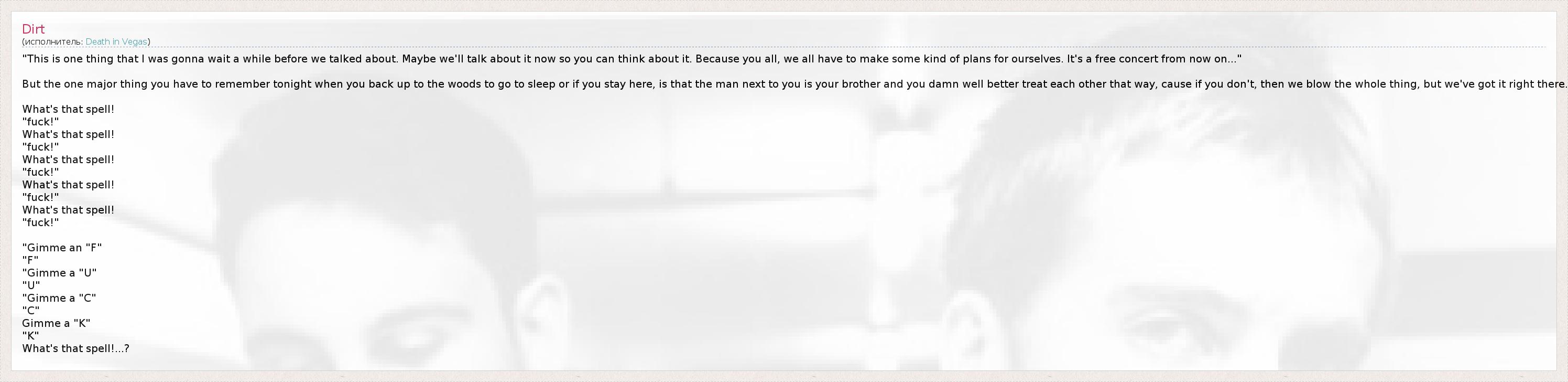 Это интересно:Творческий тандем Ричарда Фирлесса (Richard Fearless) и Тима Холмса (Tim Holmes), известный как Death in Vegas, делает музыку с полным равнодушием к жанровым ограничениям и общепринятым стандартам. Музыканты категорически игнорируют все установленные рамки, перебрасывая мостик из гипнотических ритмов и интенсивного звукового потока от рока к танцевальной музыке и размывая границы между музыкой и другими... продолжение