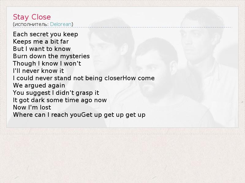 Each secret you keep Keeps me a bit far But I want to know Burn down the mysteries Though I know I won't I'll never know it I could never stand not being closerHow come We argued again You suggest I didn't grasp it It got dark some time ago now Now I'm lost Where can I reach youGet up get up get up