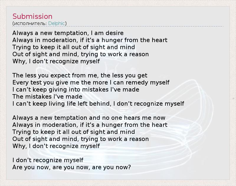 Always a new temptation, I am desire Always in moderation, if it's a hunger from the heart Trying to keep it all out of sight and mind Out of sight and mind, trying to work a reason Why, I don't recognize myself The less you expect from me, the less you get Every test you give me the more I can remedy myself I can't keep giving into mistakes I've made The mistakes I've made I can't keep living life left behind, I don't recognize myself Always a new temptation and no one hears me now Always in moderation, if it's a hunger from the heart Trying to keep it all out of sight and mind Out of sight and mind, trying to work a reason Why, I don't recognize myself I don't recognize myself Are you now, are you now, are you now?