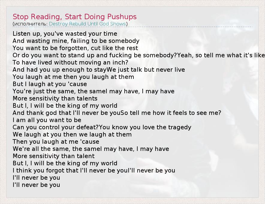 А как ты думаешь, о чем песня "Stop Reading, Start Doing Pushups" ?