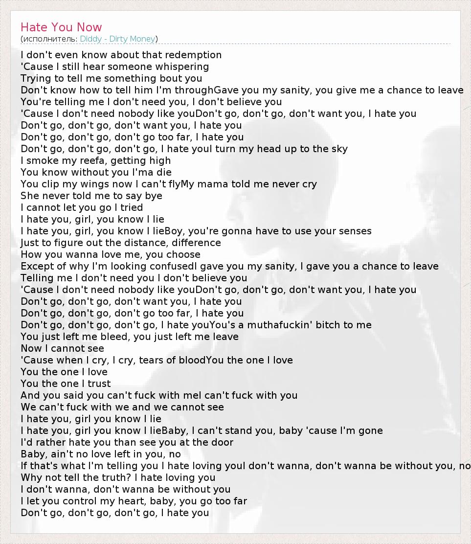 'Cause I don't need nobody like youDon't go, don't go, don't want you, I hate you
