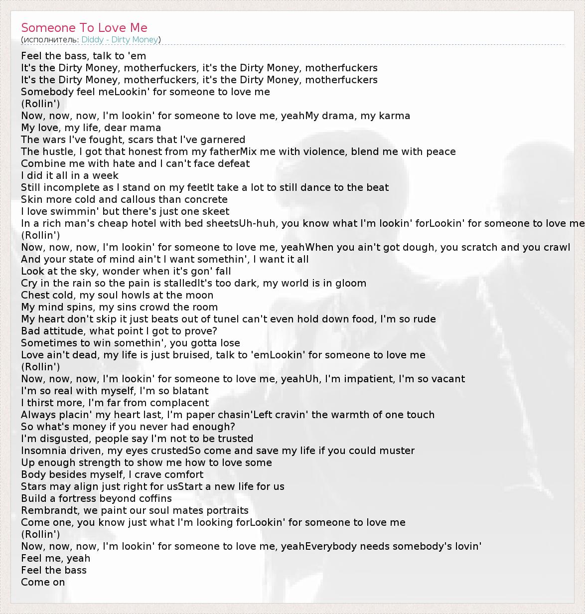Now, now, now, I'm lookin' for someone to love me, yeahWhen you ain't got dough, you scratch and you crawl