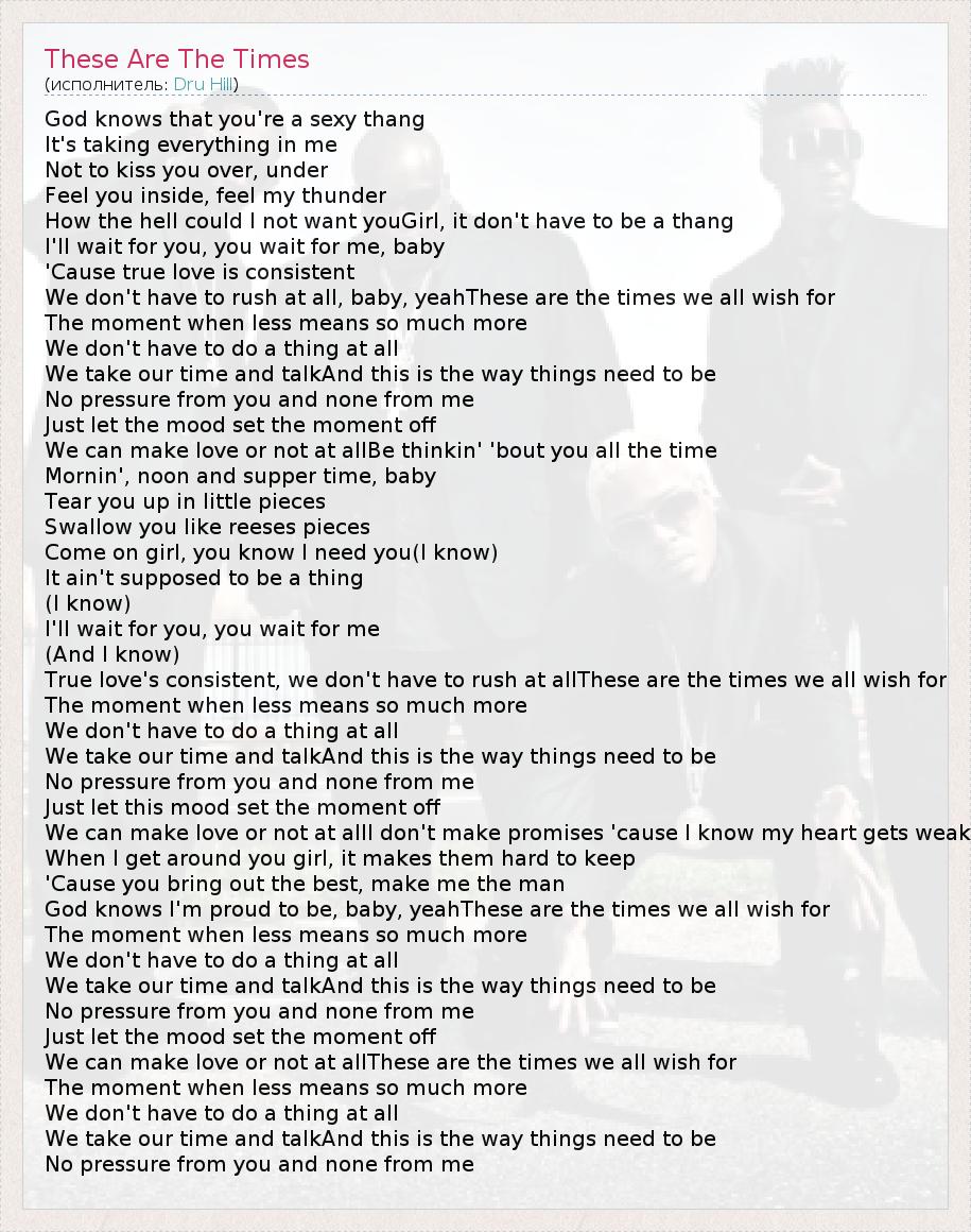 God knows that you're a sexy thang It's taking everything in me Not to kiss you over, under Feel you inside, feel my thunder How the hell could I not want youGirl, it don't have to be a thang I'll wait for you, you wait for me, baby 'Cause true love is consistent We don't have to rush at all, baby, yeahThese are the times we all wish for The moment when less means so much more We don't have to do a thing at all We take our time and talkAnd this is the way things need to be No pressure from you and none from me Just let the mood set the moment off We can make love or not at allBe thinkin' 'bout you all the time Mornin', noon and supper time, baby Tear you up in little pieces Swallow you like reeses pieces Come on girl, you know I need you(I know) It ain't supposed to be a thing (I know) I'll wait for you, you wait for me (And I know) True love's consistent, we don't have to rush at allThese are the times we all wish for The moment when less means so much more We don't have to do a thing at all We take our time and talkAnd this is the way things need to be No pressure from you and none from me Just let this mood set the moment off We can make love or not at allI don't make promises 'cause I know my heart gets weak When I get around you girl, it makes them hard to keep 'Cause you bring out the best, make me the man God knows I'm proud to be, baby, yeahThese are the times we all wish for The moment when less means so much more We don't have to do a thing at all We take our time and talkAnd this is the way things need to be No pressure from you and none from me Just let the mood set the moment off We can make love or not at allThese are the times we all wish for The moment when less means so much more We don't have to do a thing at all We take our time and talkAnd this is the way things need to be No pressure from you and none from me