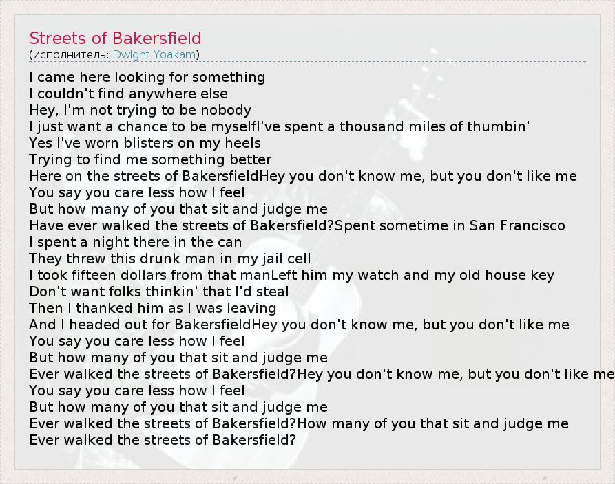 А как ты думаешь, о чем песня "Streets of Bakersfield" ?