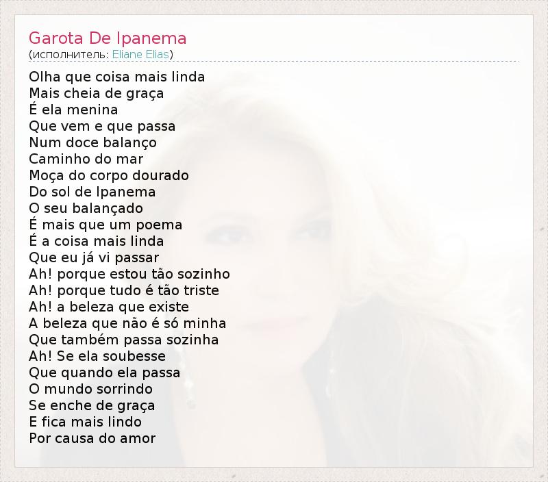 Olha que coisa mais linda Mais cheia de graça É ela menina Que vem e que passa Num doce balanço Caminho do mar Moça do corpo dourado Do sol de Ipanema O seu balançado É mais que um poema É a coisa mais linda Que eu já vi passar Ah! porque estou tão sozinho Ah! porque tudo é tão triste Ah! a beleza que existe A beleza que não é só minha Que também passa sozinha Ah! Se ela soubesse Que quando ela passa O mundo sorrindo Se enche de graça E fica mais lindo Por causa do amor