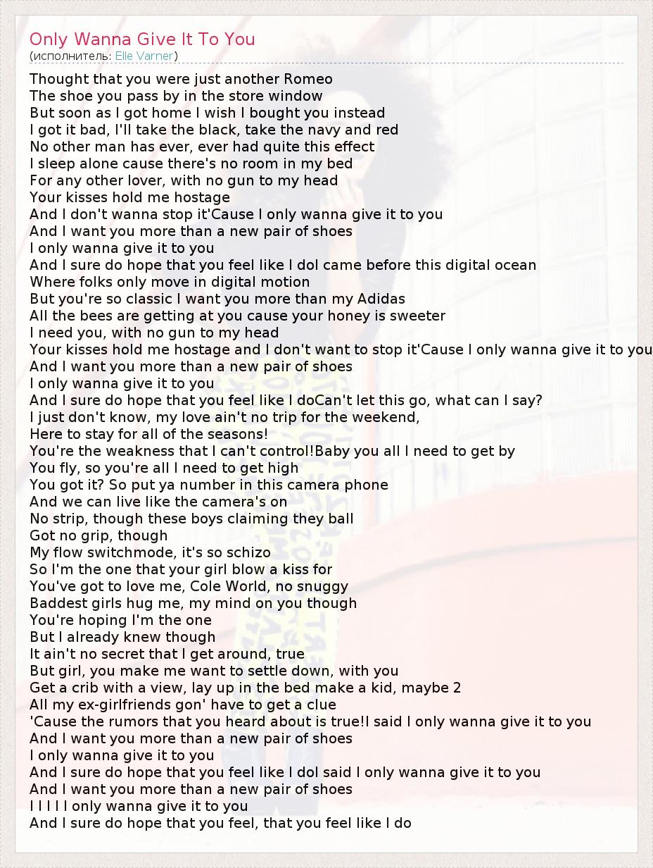 Thought that you were just another Romeo The shoe you pass by in the store window But soon as I got home I wish I bought you instead I got it bad, I'll take the black, take the navy and red No other man has ever, ever had quite this effect I sleep alone cause there's no room in my bed For any other lover, with no gun to my head Your kisses hold me hostage And I don't wanna stop it'Cause I only wanna give it to you And I want you more than a new pair of shoes I only wanna give it to you And I sure do hope that you feel like I doI came before this digital ocean Where folks only move in digital motion But you're so classic I want you more than my Adidas All the bees are getting at you cause your honey is sweeter I need you, with no gun to my head Your kisses hold me hostage and I don't want to stop it'Cause I only wanna give it to you And I want you more than a new pair of shoes I only wanna give it to you And I sure do hope that you feel like I doCan't let this go, what can I say? I just don't know, my love ain't no trip for the weekend, Here to stay for all of the seasons! You're the weakness that I can't control!Baby you all I need to get by You fly, so you're all I need to get high You got it? So put ya number in this camera phone And we can live like the camera's on No strip, though these boys claiming they ball Got no grip, though My flow switchmode, it's so schizo So I'm the one that your girl blow a kiss for You've got to love me, Cole World, no snuggy Baddest girls hug me, my mind on you though You're hoping I'm the one But I already knew though It ain't no secret that I get around, true But girl, you make me want to settle down, with you Get a crib with a view, lay up in the bed make a kid, maybe 2 All my ex-girlfriends gon' have to get a clue 'Cause the rumors that you heard about is true!I said I only wanna give it to you And I want you more than a new pair of shoes I only wanna give it to you And I sure do hope that you feel like I doI said I only wanna give it to you And I want you more than a new pair of shoes I I I I I only wanna give it to you And I sure do hope that you feel, that you feel like I do