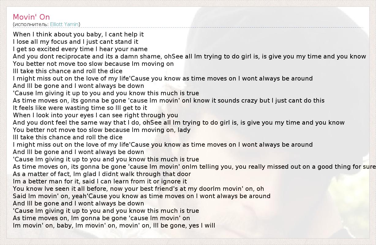 When I think about you baby, I cant help it I lose all my focus and I just cant stand it I get so excited every time I hear your name And you dont reciprocate and its a damn shame, ohSee all Im trying to do girl is, is give you my time and you know You better not move too slow because Im moving on Ill take this chance and roll the dice I might miss out on the love of my life'Cause you know as time moves on I wont always be around And Ill be gone and I wont always be down 'Cause Im giving it up to you and you know this much is true As time moves on, its gonna be gone 'cause Im movin' onI know it sounds crazy but I just cant do this It feels like were wasting time so Ill get to it When I look into your eyes I can see right through you And you dont feel the same way that I do, ohSee all Im trying to do girl is, is give you my time and you know You better not move too slow because Im moving on, lady Ill take this chance and roll the dice I might miss out on the love of my life'Cause you know as time moves on I wont always be around And Ill be gone and I wont always be down 'Cause Im giving it up to you and you know this much is true As time moves on, its gonna be gone 'cause Im movin' onIm telling you, you really missed out on a good thing for sure As a matter of fact, Im glad I didnt walk through that door Im a better man for it, said I can learn from it or ignore it You know Ive seen it all before, now your best friend's at my doorIm movin' on, oh Said Im movin' on, yeah'Cause you know as time moves on I wont always be around And Ill be gone and I wont always be down 'Cause Im giving it up to you and you know this much is true As time moves on, Im gonna be gone 'cause Im movin' on Im movin' on, baby, Im movin' on, movin' on, Ill be gone, yes I will