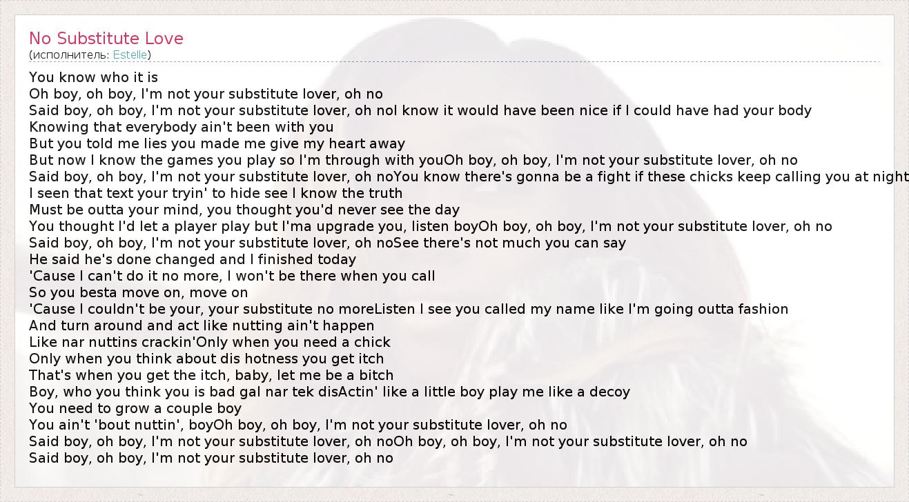 Said boy, oh boy, I'm not your substitute lover, oh noOh boy, oh boy, I'm not your substitute lover, oh no