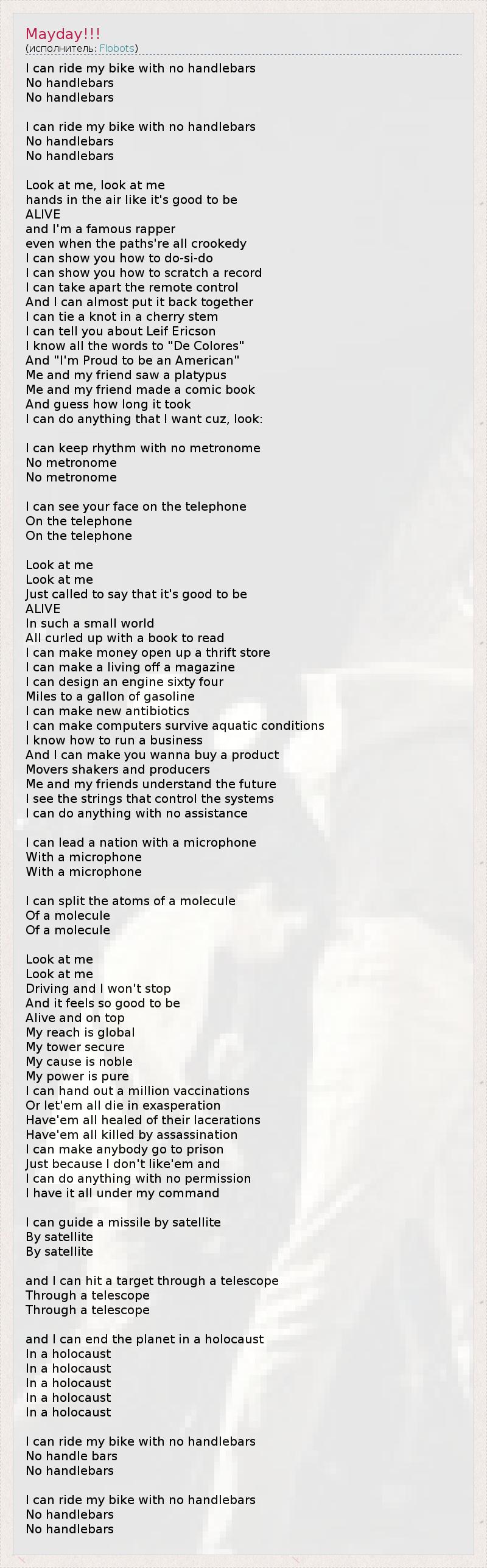 Это интересно:Flobots - американская группа из Денвера, Колорадо. Пятеро разноцветных мужчин и одна женщина играют альтернативный рок, щедро сдабривая его рэпом и фолком Альбом "Fight With Tools" – это третья полновесная работа коллектива и первая – на мейджоре. Старт на пятнадцатом месте Billboard был неплохим началом, а успех "Handlebars" на рок радиостанциях подкрепил его. Эта песня была записана три года... продолжение