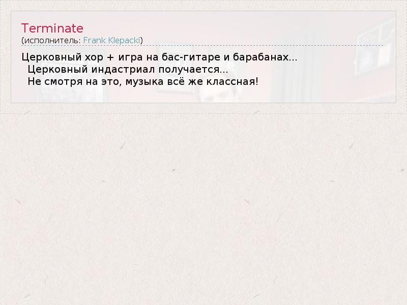 Это интересно:Фрэнк Клепаки (Клепацкий) появился на свет 25 мая 1974 года в Лас-Вегасе, в семье польских эмигрантов. Родители Фрэнка были профессиональными музыкантами, поэтому страсть к музыке проявилась у мальчика уже в 8 лет, когда ему подарили набор барабанов. Уже в 11 он стал профессиональным ударником. Самое сильное влияние в этот, несомненно важный для любого композитора, период формирования музыкального... продолжение