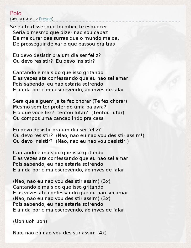 Это интересно:Fresno является бразильской рок-группой, образованной в Порту-Алегри в конце 1999 года. В настоящее время состав группы такой: Лукас Сильвейра (вокал, ритм-гитара, клавишные), Густаво Мантовани (соло-гитара), Белл Рашель (барабаны) и Марио Камело (клавишные). У них уже есть пять альбомов, последний из которых - "Revanche". Лукас, Густаво, Леандро Перэйра и Педро Купертино (первый состав коллектива)... продолжение