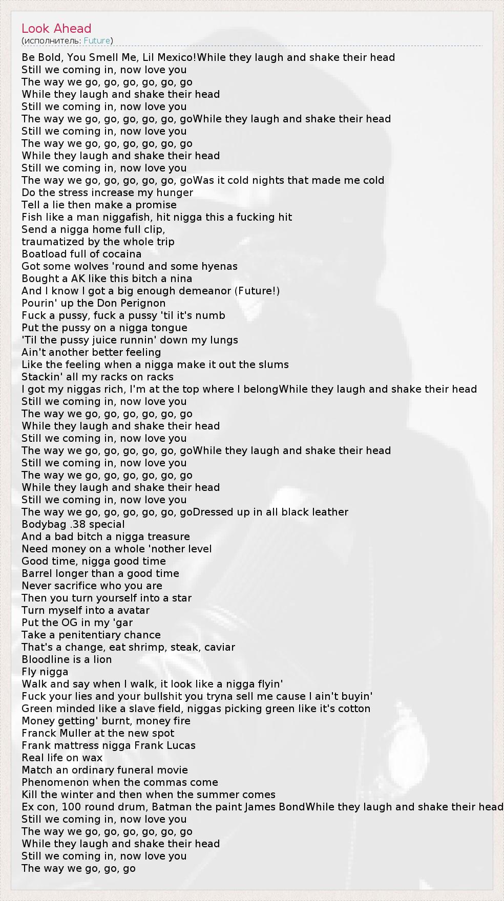 Это интересно:Nayvadius Cash (born Nayvadius Wilburn on November 20, 1985), better known by his stage name Future is an American rapper from Kirkwood, Atlanta, Georgia. He is currently signed to the record label Epic Records.His name was came about after members of The Dungeon Family called him "The Future" . His cousin, producer Rico Wade of Dungeon Family, encouraged him to sharpen his writing skills and pursue music.From 2010 to early 2011, Future released a series of mixtapes including 1000, Dirty Sprite and True Story.The latter included the single "Tony Montana", in reference to the Scarface film. During this time, Future also partnered with Gucci Mane on the Free Bricks collaborative... продолжение